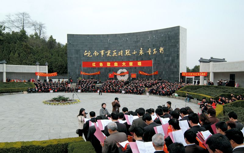 陵園西側(cè)為皖南事變史料陳列室,室內(nèi)有前主席江澤民和前總理李鵬為紀(jì)念皖南事變五十周年的題詞:“青山埋忠骨,精神育后人”、“發(fā)揚革命英雄主義,皖南事變殉難烈士浩氣長存”。