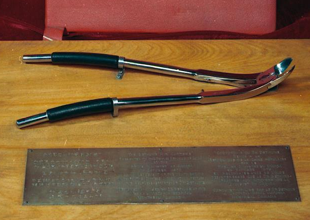 不銹鋼質地,剪刀形。長33厘米,柄長為剪刀頭的9倍,柄上安有橡皮抓手。現存完整。這是白求恩在加拿大設計發明并使用過的醫療器械。