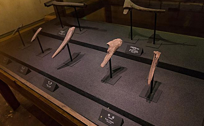這是出土的主要農耕工具——骨耜,河姆渡遺址兩次發掘共出土190余件,其他少量遺址中也有一些出土,它是由大型偶蹄類動物肩胛骨制作而成,一般正面中部從上到下鑿磨有一道淺凹槽,頂端側面鑿有橫穿方銎,縱槽下端兩側分別有一個長圓形孔,這是為了固定豎向木柄用的。根據出土的用藤條捆綁木柄的骨耜和橫穿方銎中殘留著當時捆綁木柄的藤條的骨耜,復原出完整的完整的古代農具——耒耜。它的功能類似于今天所用的鐵鍬,可以用來翻耕土地,修筑田埂,開溝排水等。
