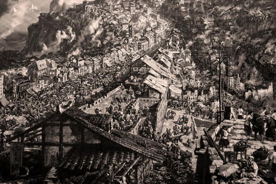 1938年至1943年間日機空襲重慶(含對空監視范圍)203次,出動飛機437批,9166架次,炸、焚毀房屋17452棟,37182間,造成人員傷亡2、5萬余人。其間的1941年6月5日晚,日機24架分三批偷襲重慶,在5個多小時的疲勞轟炸中,渝中區十八梯、石灰市和演武廳(現磁器街)三段防空隧道內,發生了震驚中外、慘不忍睹的避難民眾窒息、踐踏慘案,造成人員傷亡2500人左右。